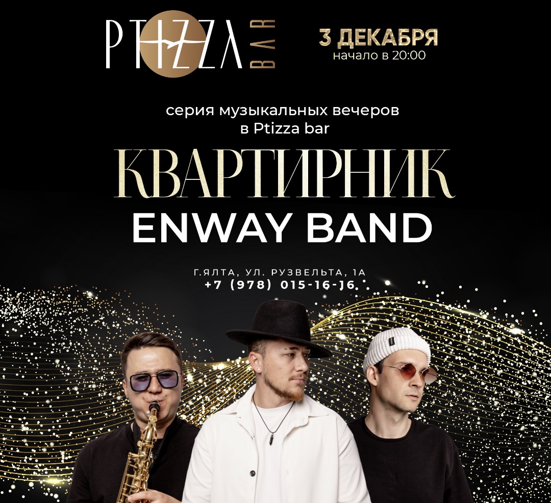 Этот вечер станет особенным, потому что под куполом Ptizza Bar выступит музыкальная кавер группа ENWAY BAND, которая объединяет в себе харизму и профессионализм. Эти ребята уже успели приобрести множество регалий, но самое главное то, как они тонко чувствуют атмосферу, заряжая своей энергией каждого, кто попал под её влияние.